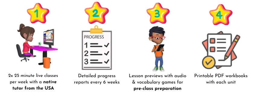Lessons are structured to match the learning style of young students, using interactive activities, games, and guided speaking practice to keep children engaged.
